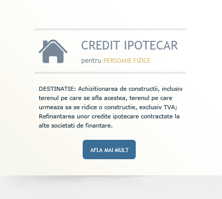 Portofoliul nostru de produse acopera solutii pentru leasing auto, leasing imobiliar, leasing de echipamente si credite: credit cu garantie imobiliara, credit ipotecar, credit pentru investitii, credit proiecte fonduri nerambursabile, credit punte, linie de credit.